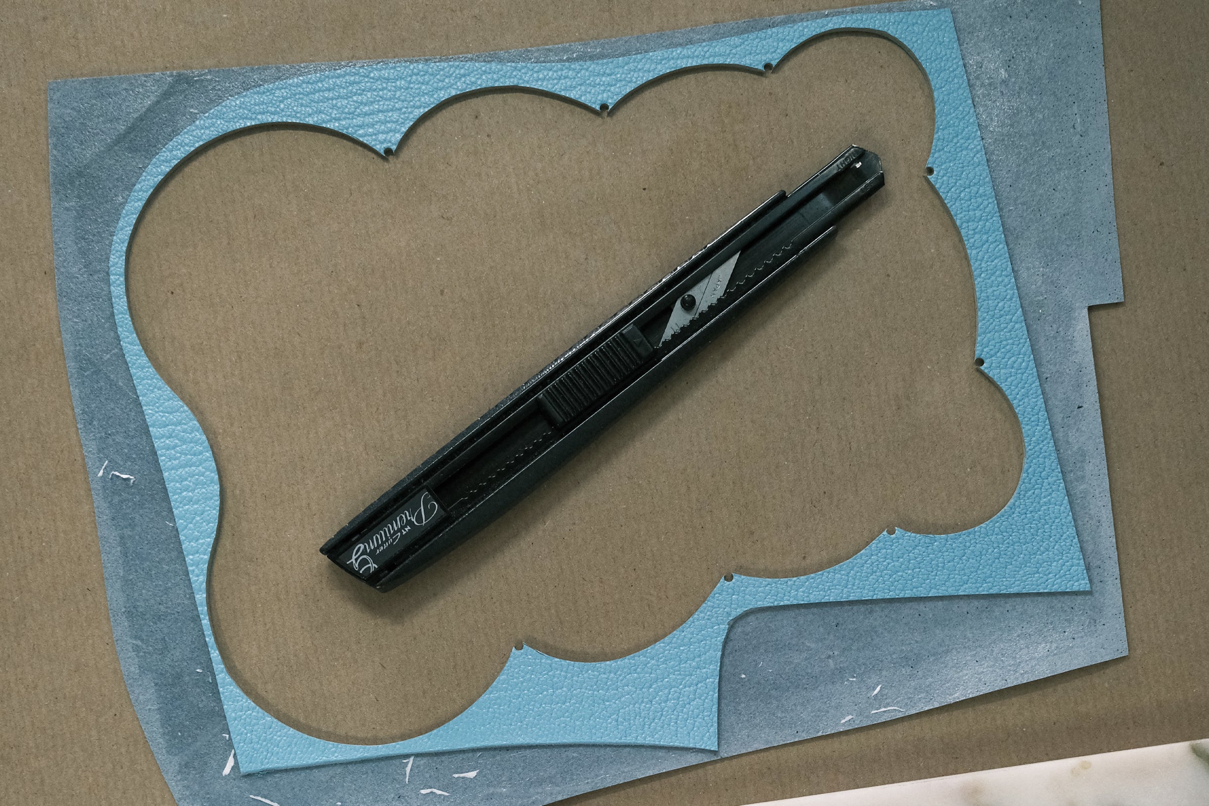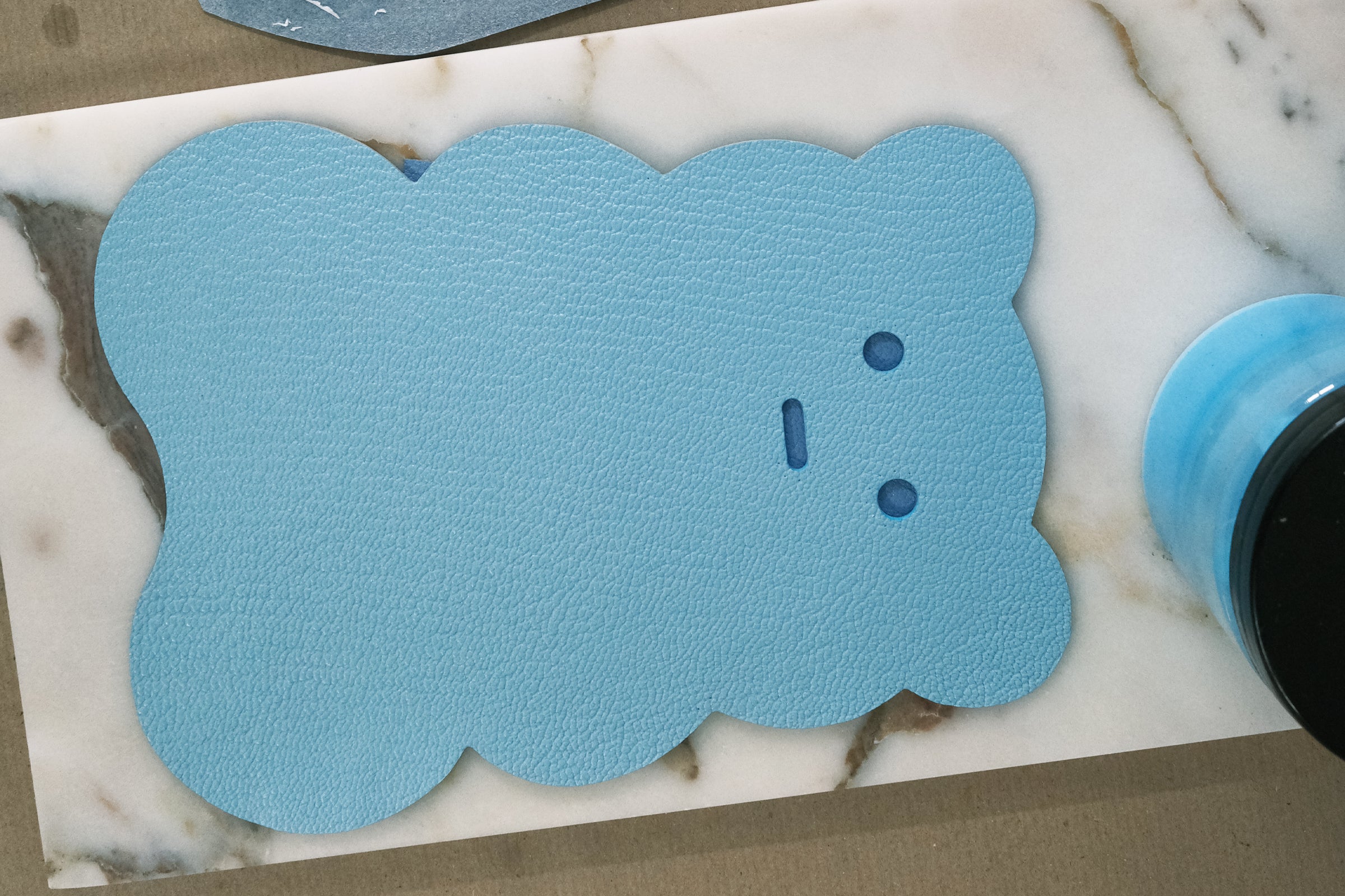 Before and after of cutting the main panel of a Blubby Bear pochette in baby blue chèvre.