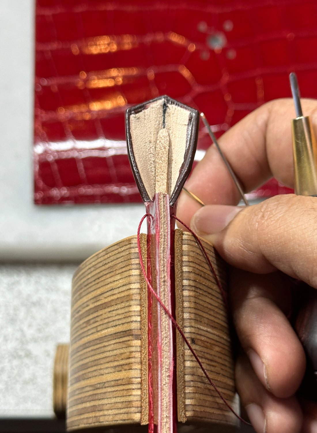 Hand-stitching rolled handle in crocodile skin. The internal structure is made up of different leathers; leatherboard, chèvre and leather cord.