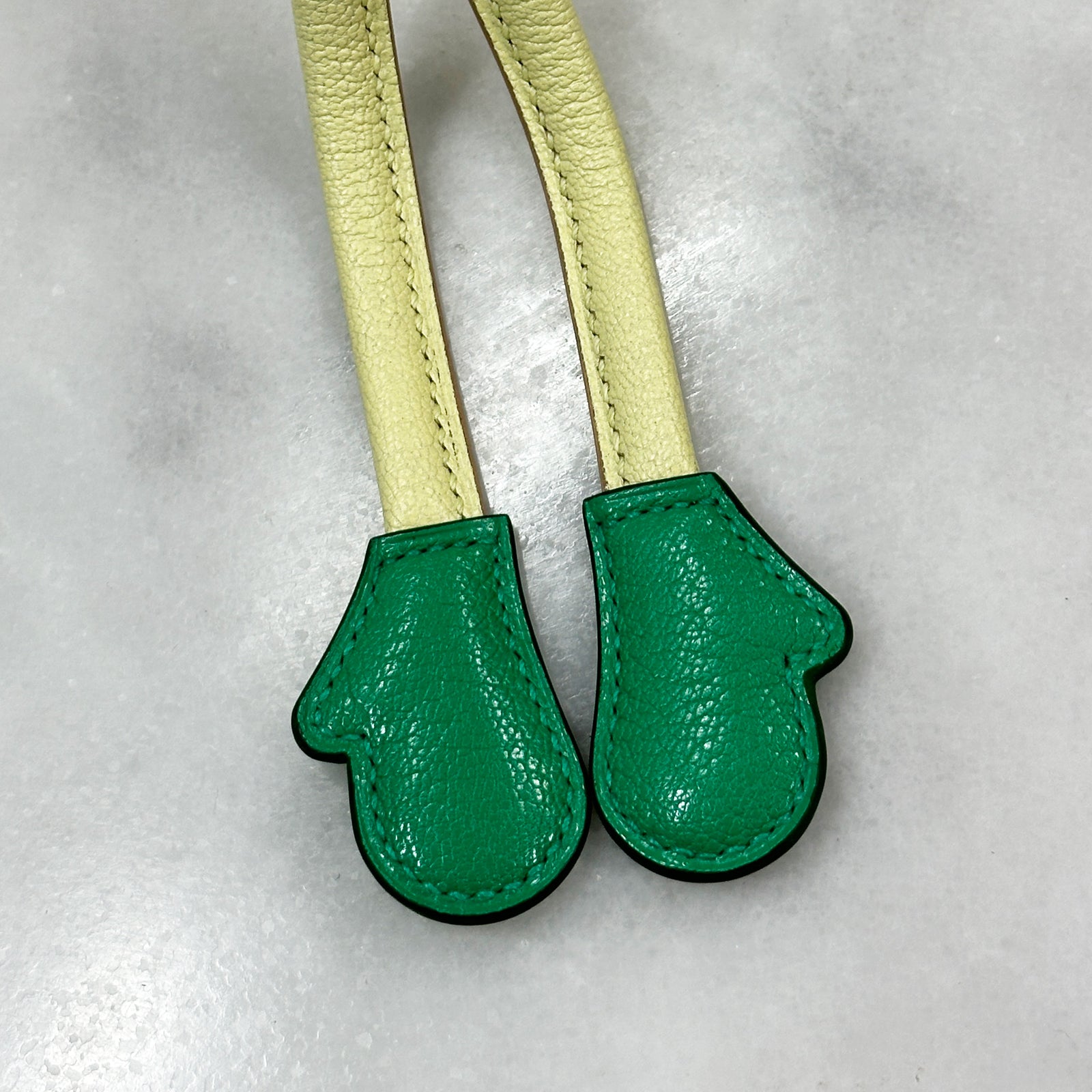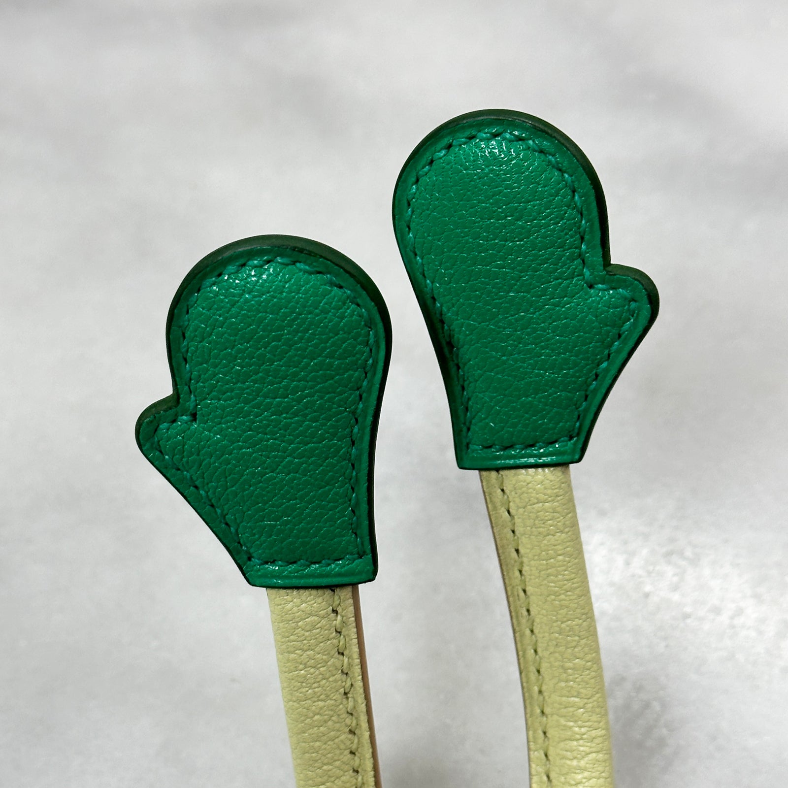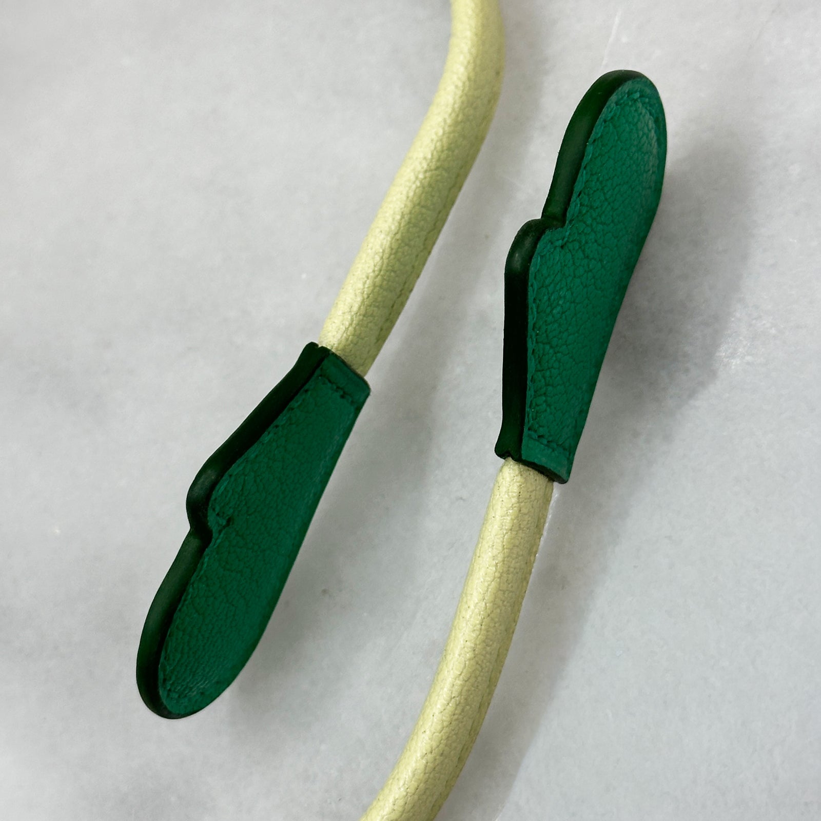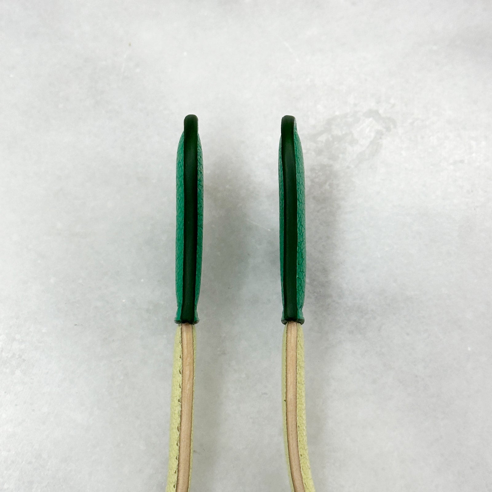 Forest green chèvre hands with bottle green edge paint and lemonade chèvre arms with rose gold edge paint.