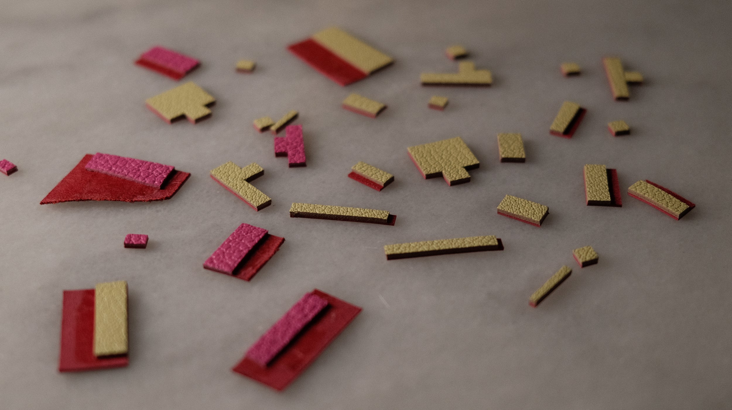 Precision hand cutting parts for KDP wallet. Straw yellow chèvre backed with calfskin.