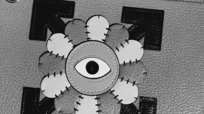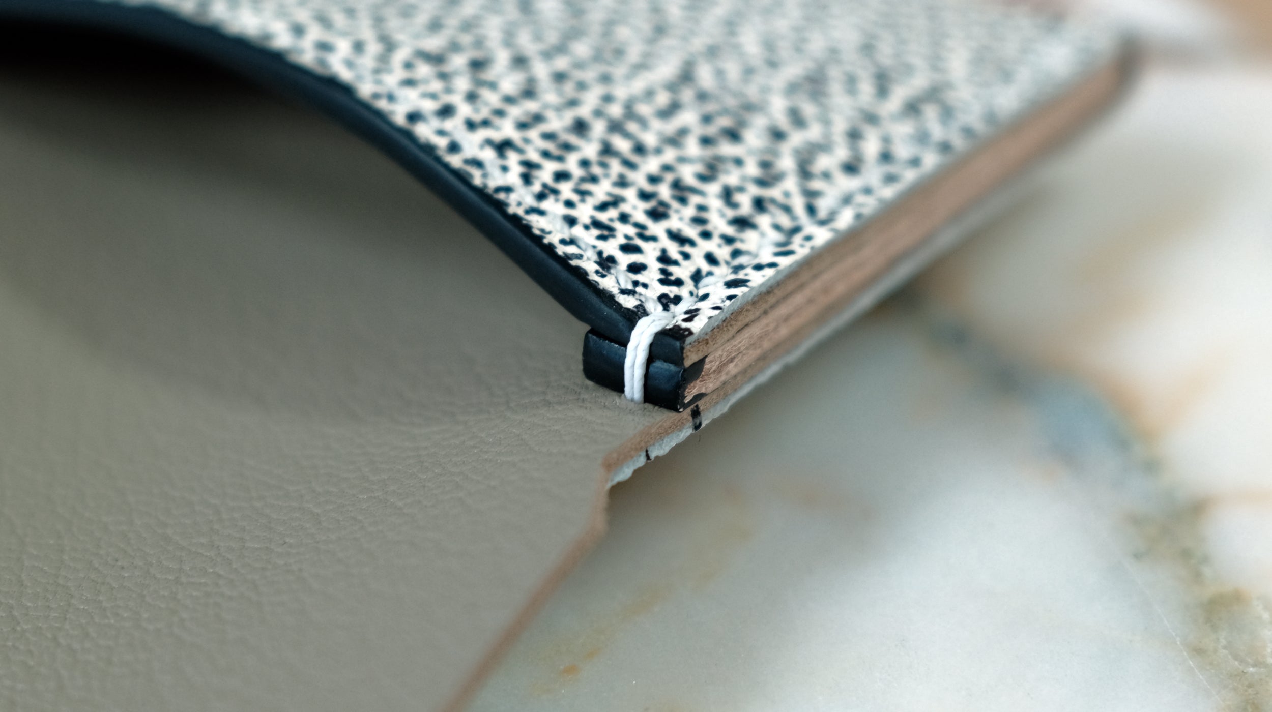 Threading over front-panel of mini wallet pochette and raw 6-layer thick edge.